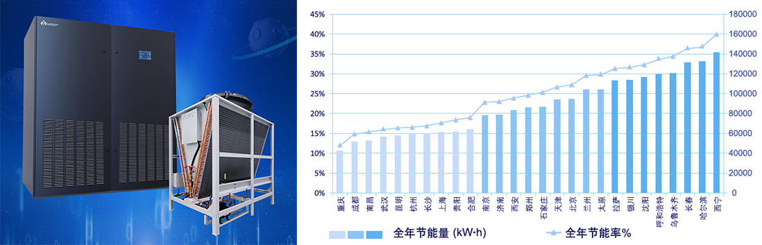 二、搭配离心氟泵,三种运行模式:高于25℃采用机械制冷;5-25℃采用混合制冷,低于5℃采用氟泵运行模式,全年节能达40%;